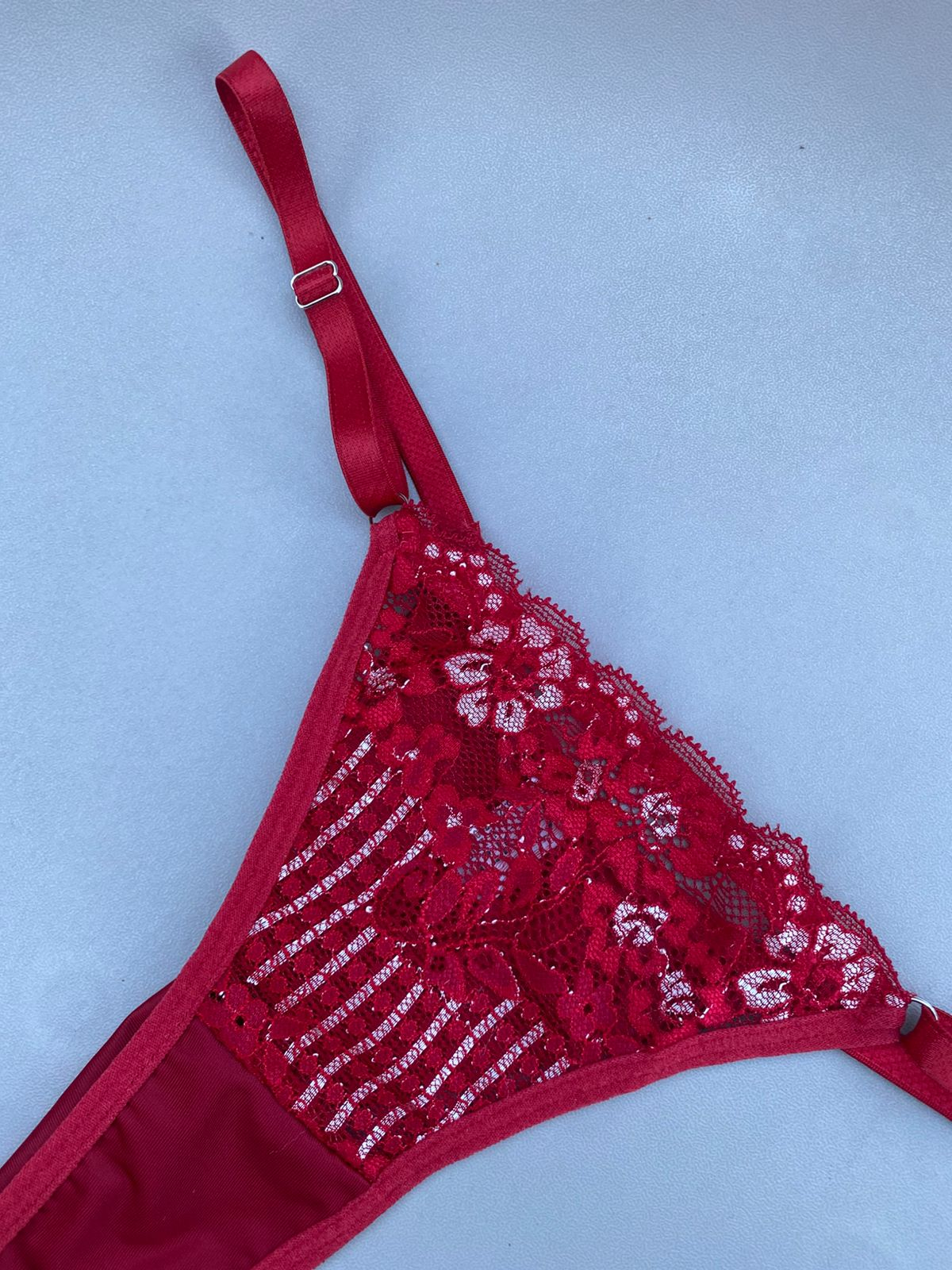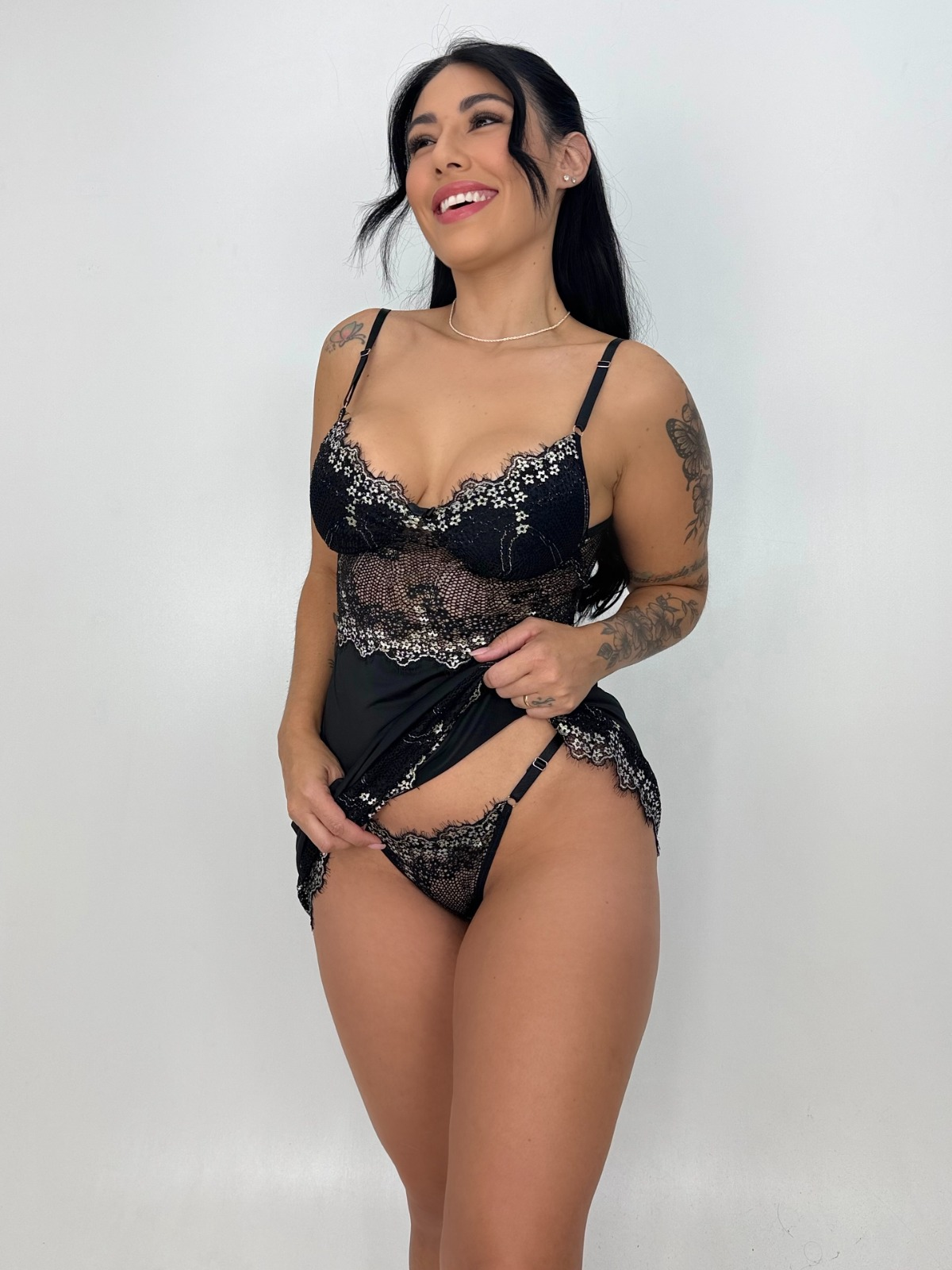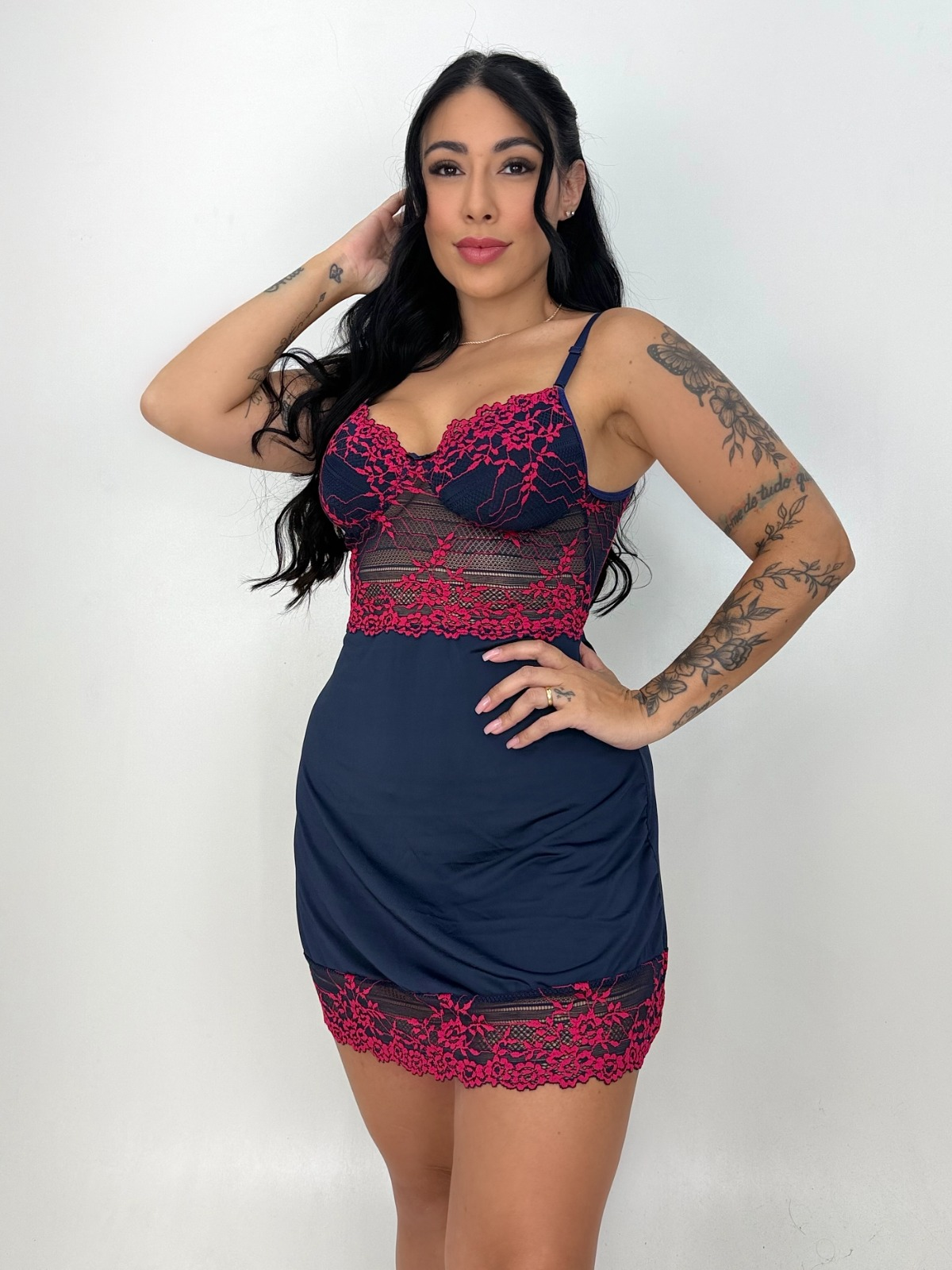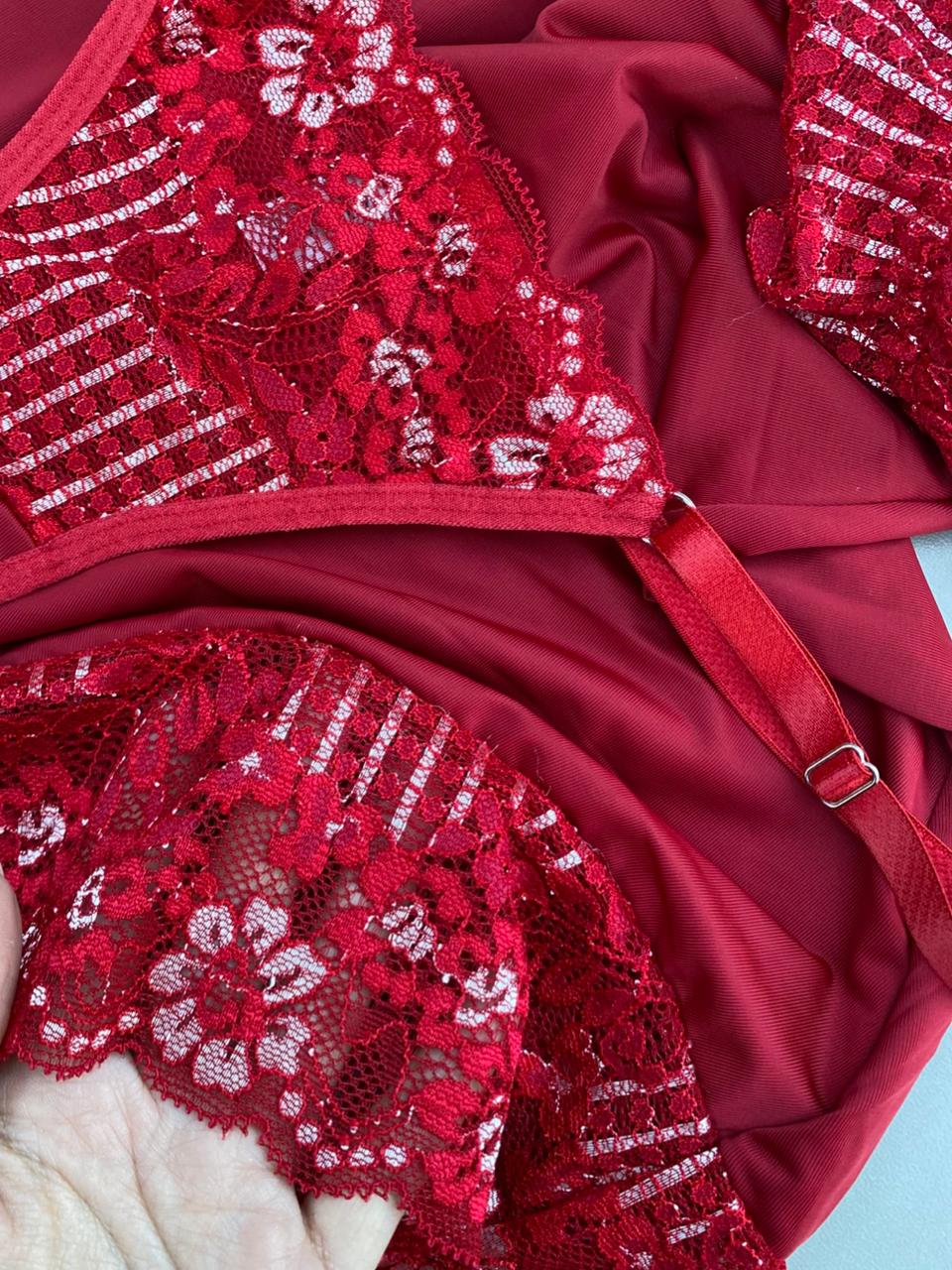 Abaixo do busto, a renda vazada adiciona charme e leveza, enquanto a barra em renda vazada completa o visual romântico da peça.