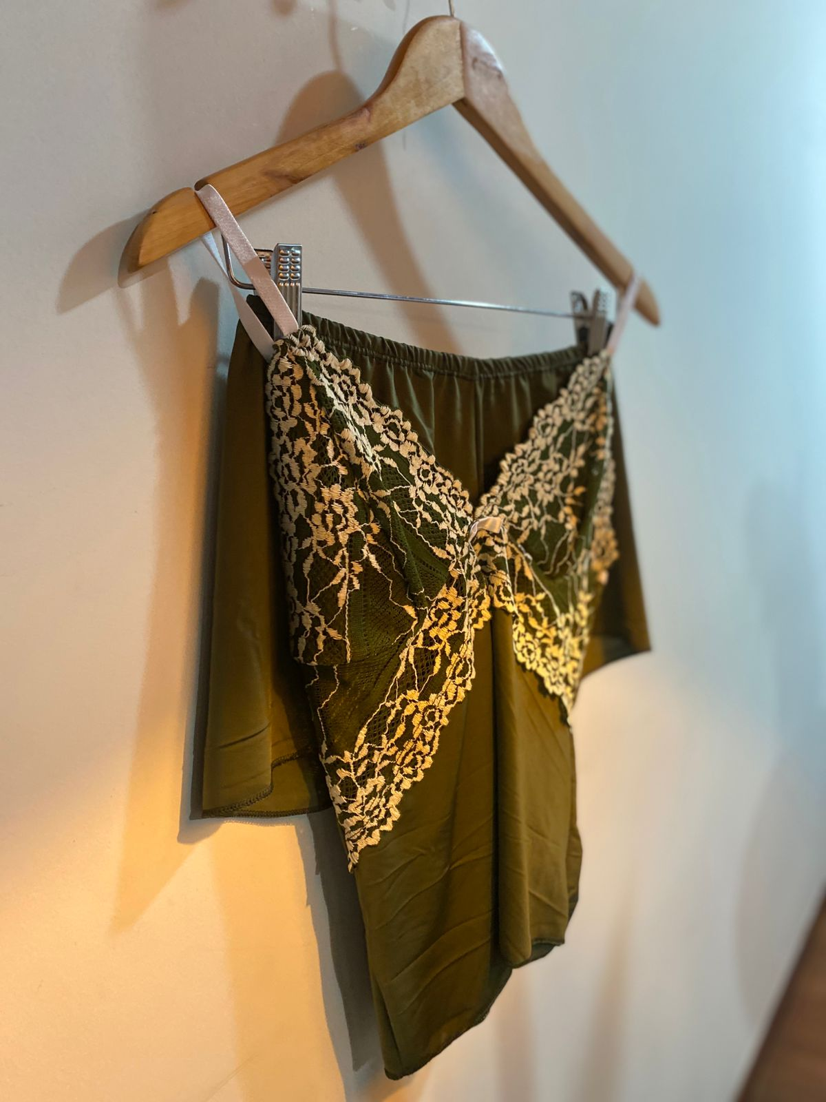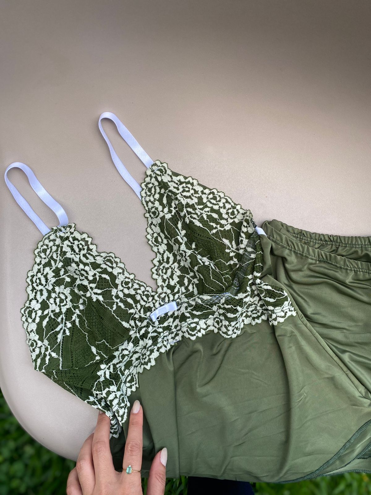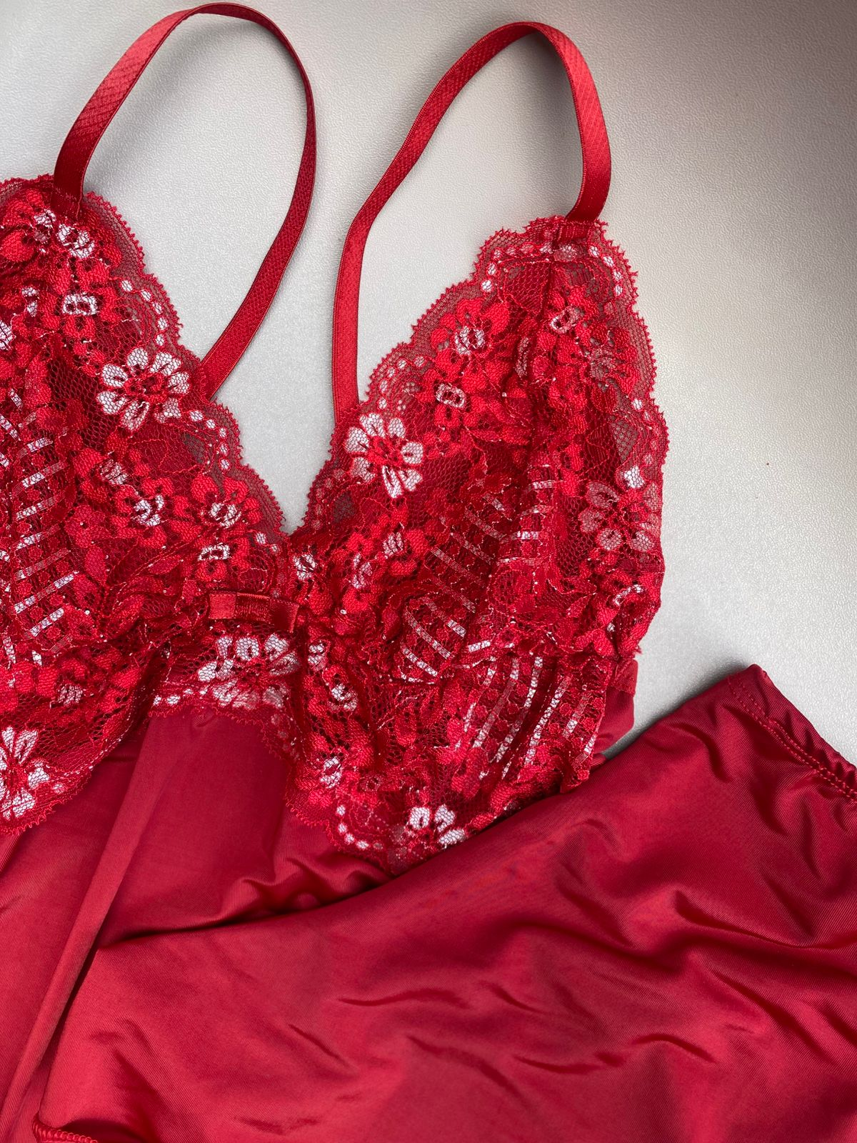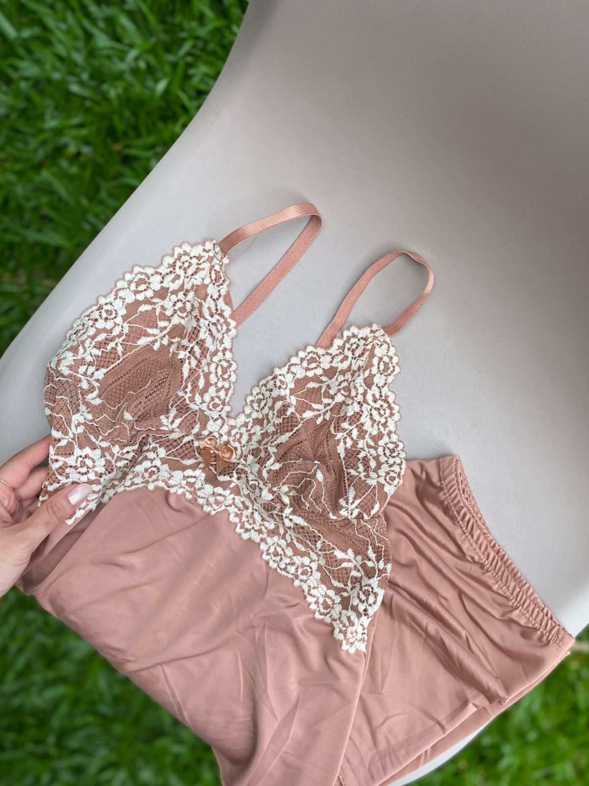 Regata em liganete com busto coberto em renda e abaixo do busto renda vazada formato V invertido, alças reguláveis.