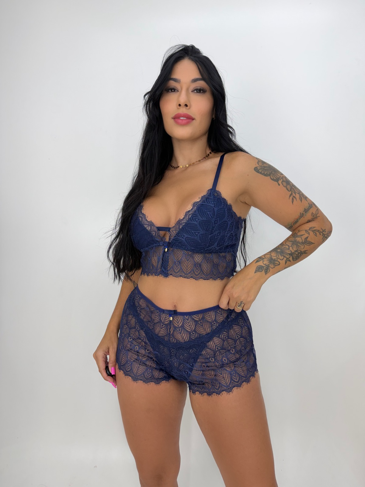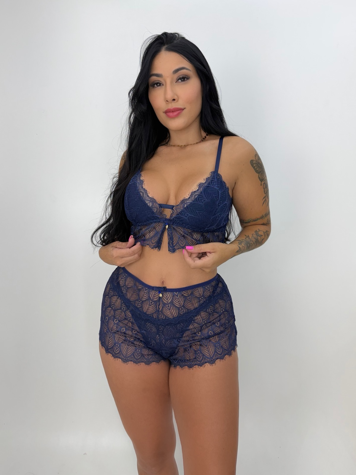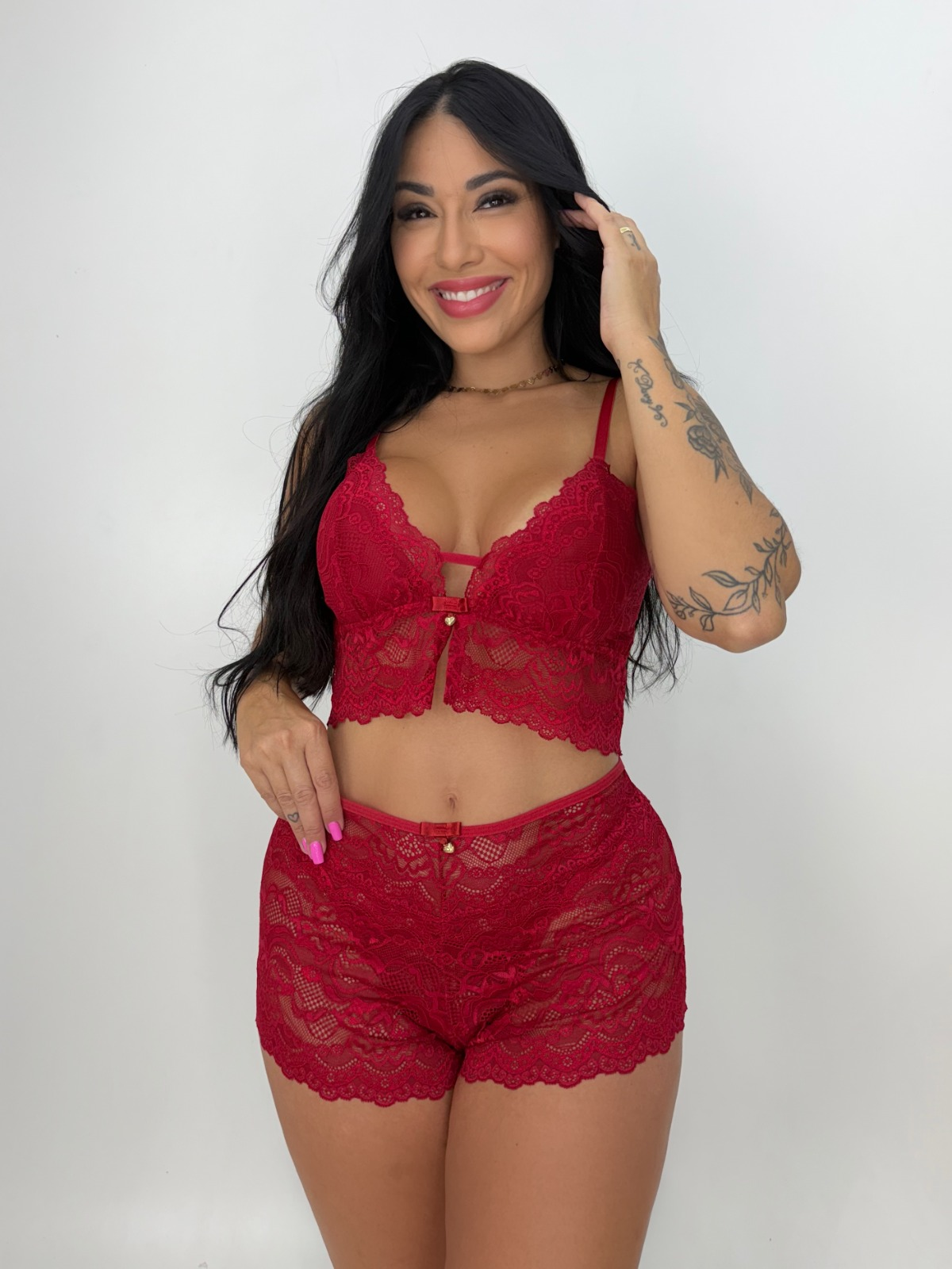 Item 2: Short de lingerie em renda vazada estilo soltinho, com elástico na cintura + detalhe no corte, acompanha laço e pingente cor dourado.