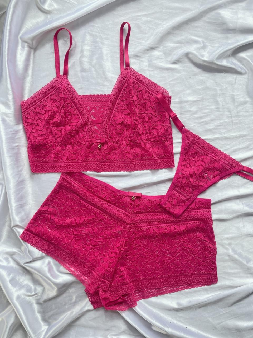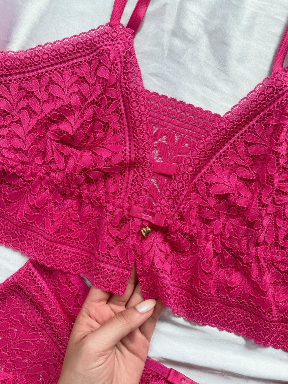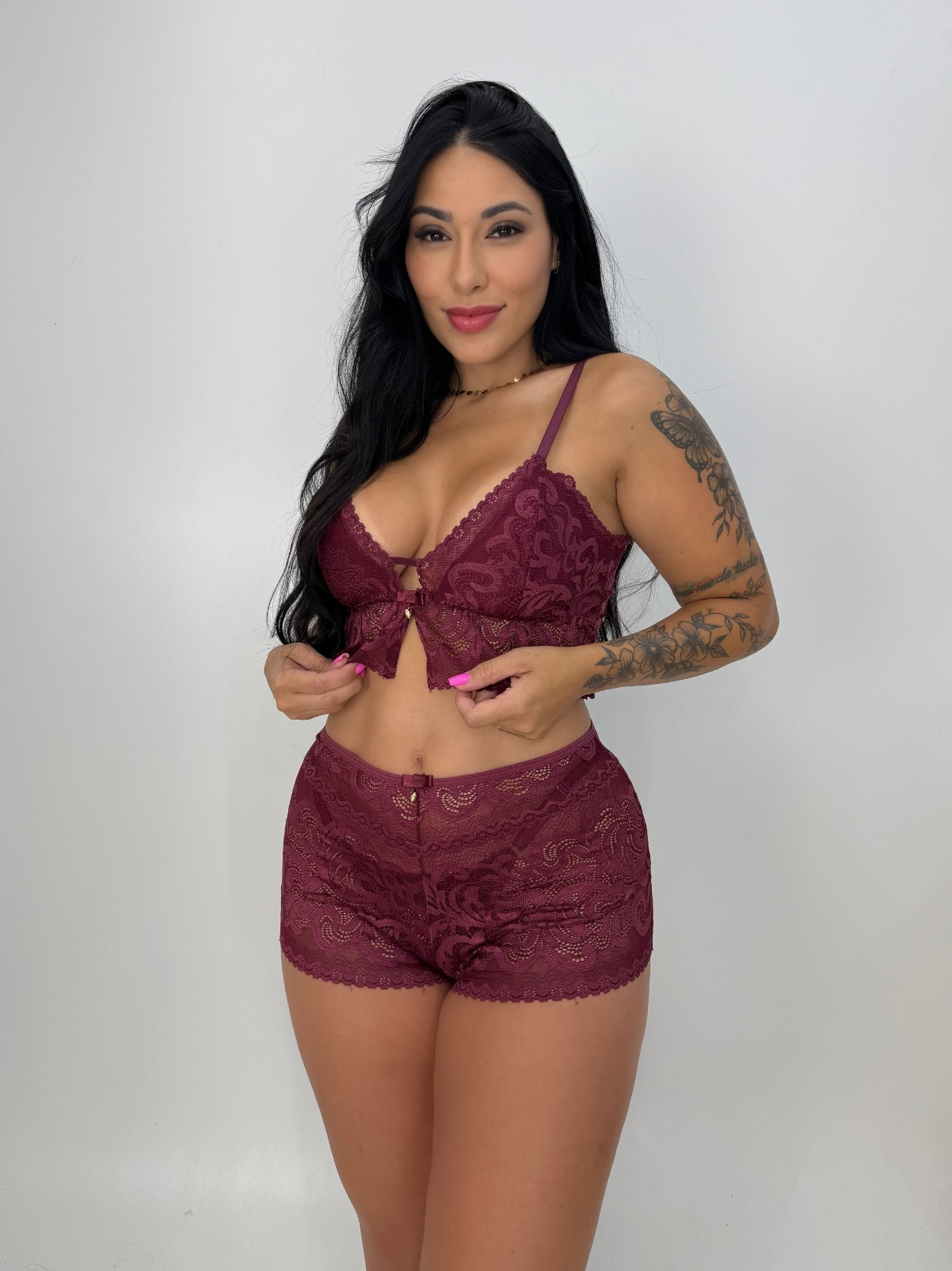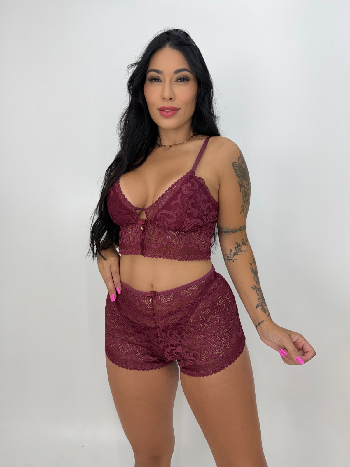Item 2: Short de lingerie em renda vazada estilo soltinho, com elástico na cintura + detalhe no corte, acompanha laço e pingente cor dourado.