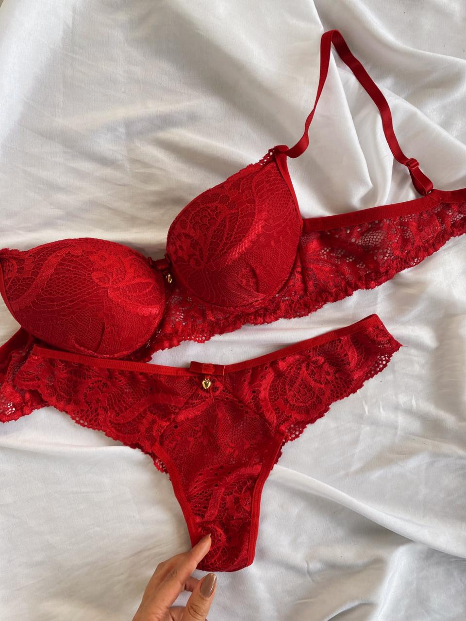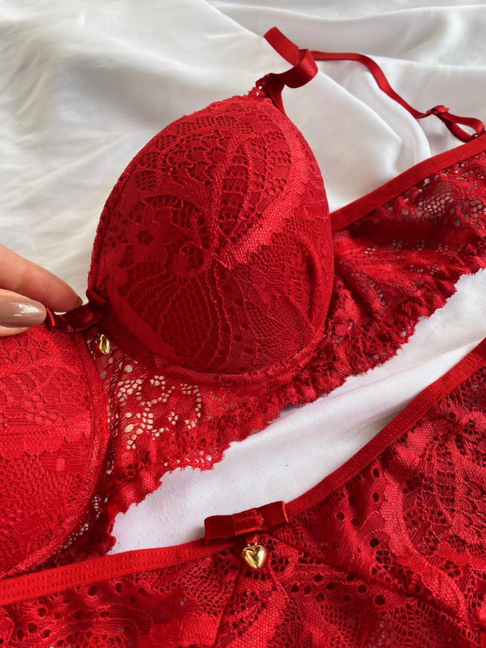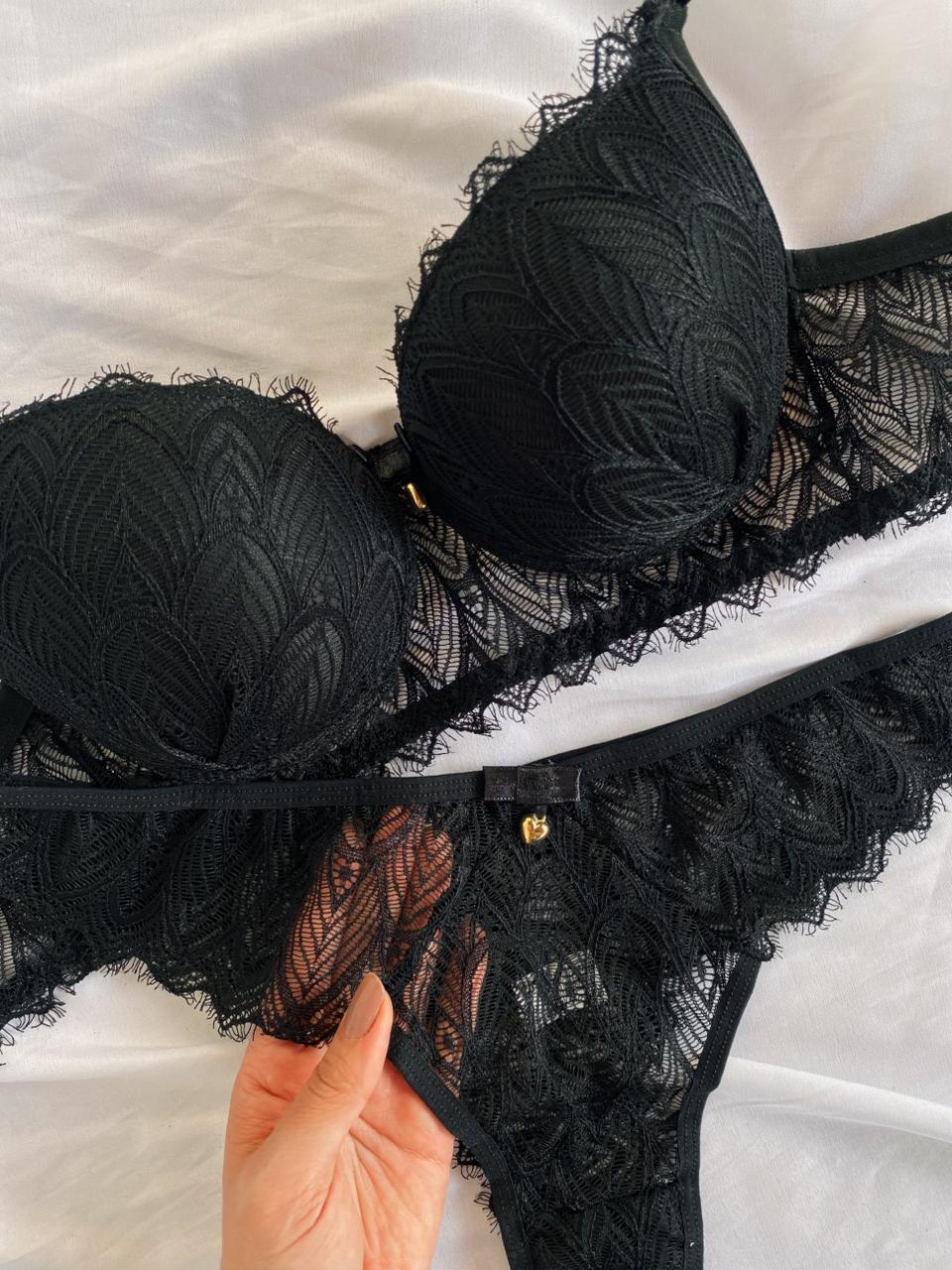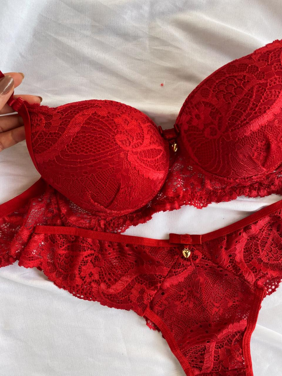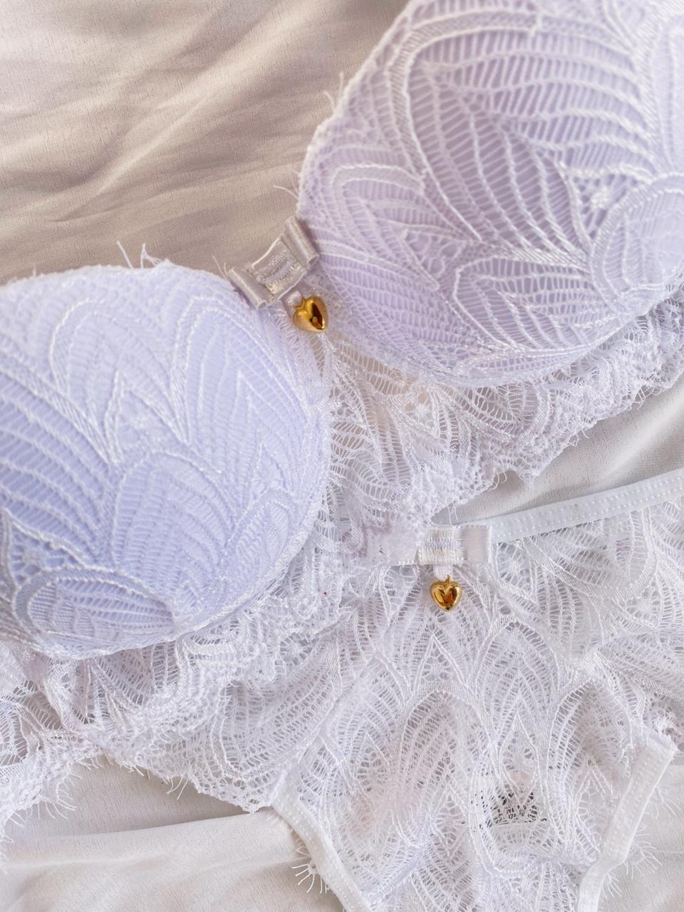 O Conjunto Rute é a escolha ideal para quem busca sensualidade com sofisticação. Confeccionado em renda de poliamida, o sutiã possui bojo com delicado detalhe franzido na parte frontal, valorizando o busto e trazendo um charme especial à peça. Acompanha laço com pingente dourado em formato de coração. As alças possuem regulagem e o fecho traseiro é de encaixe, com duas opções de regulagem.