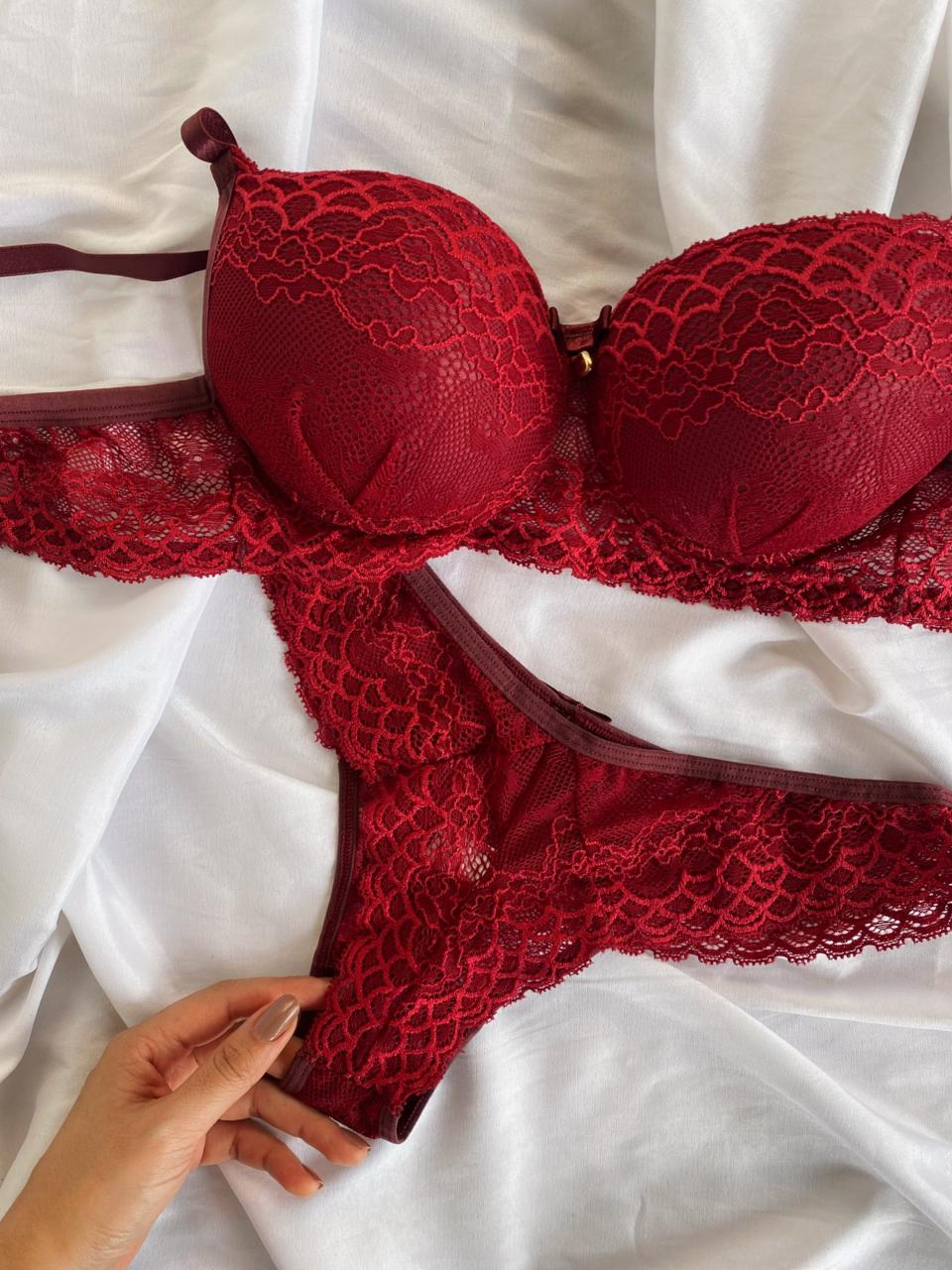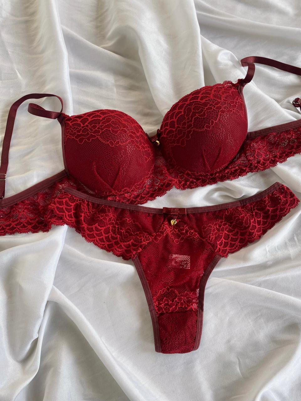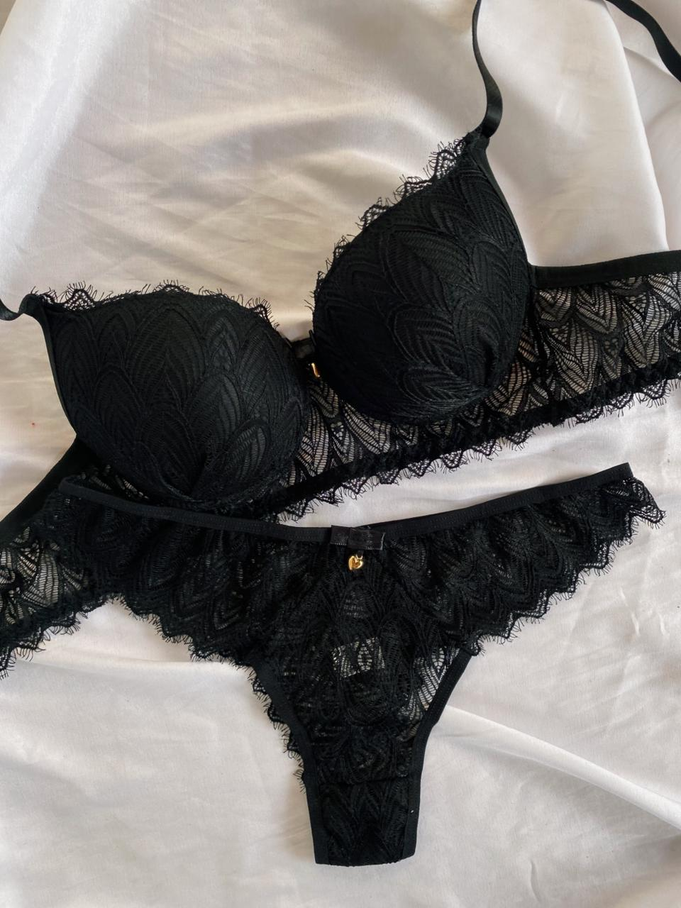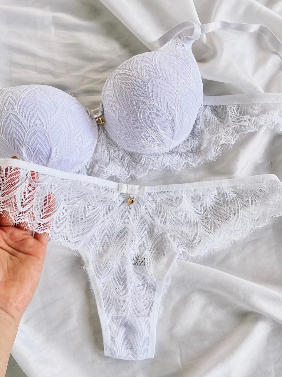 O Conjunto Rute é a escolha ideal para quem busca sensualidade com sofisticação. Confeccionado em renda de poliamida, o sutiã possui bojo com delicado detalhe franzido na parte frontal, valorizando o busto e trazendo um charme especial à peça. Acompanha laço com pingente dourado em formato de coração. As alças possuem regulagem e o fecho traseiro é de encaixe, com duas opções de regulagem.